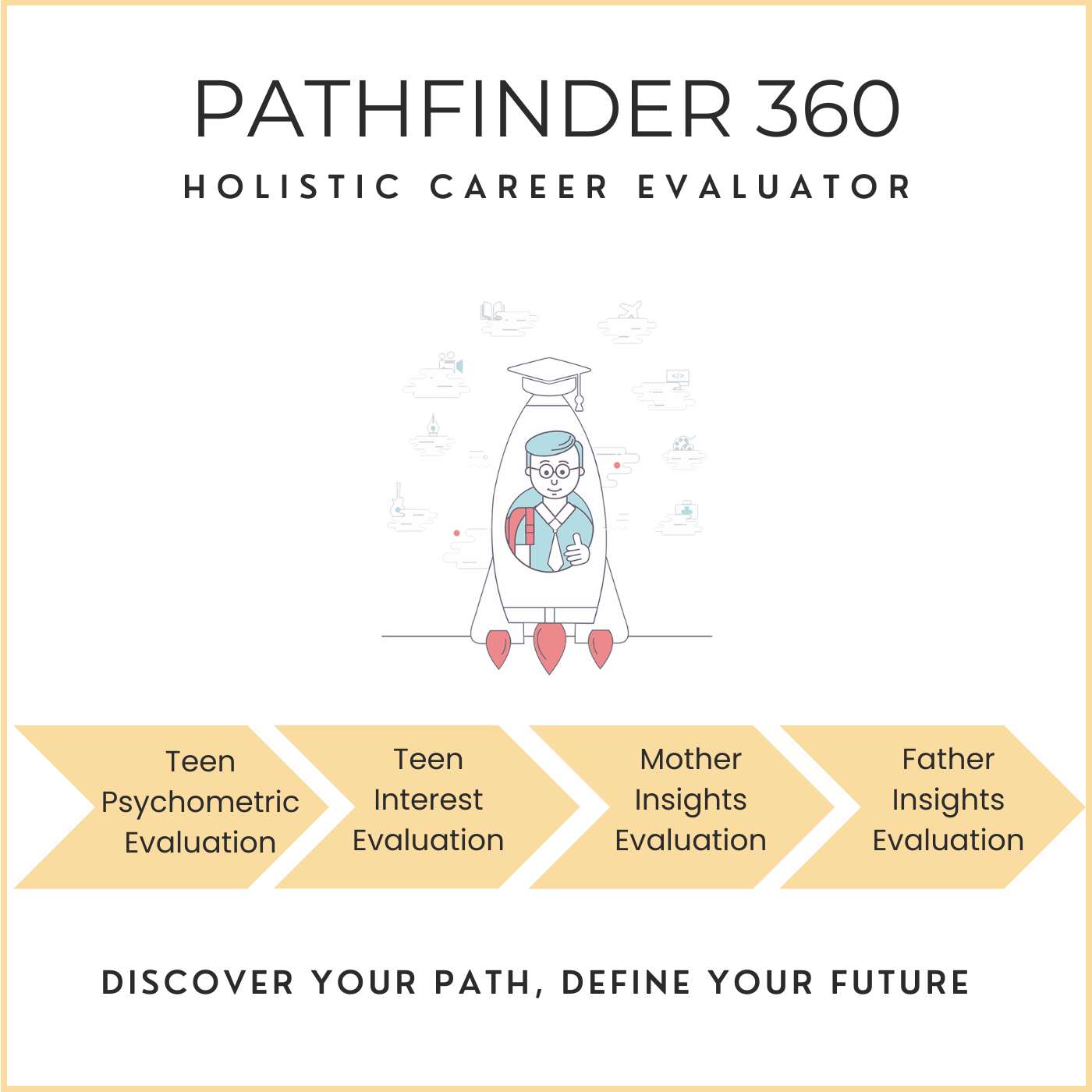 Pathfinder 360 is a holistic career evaluator that considers 4 dimensions for arriving at the best career choice. For each dimension – a separate evaluation link is sent. The result from all the 4 evaluations is scientifically synthesized into the Pathfinder 360 Career Summary report.